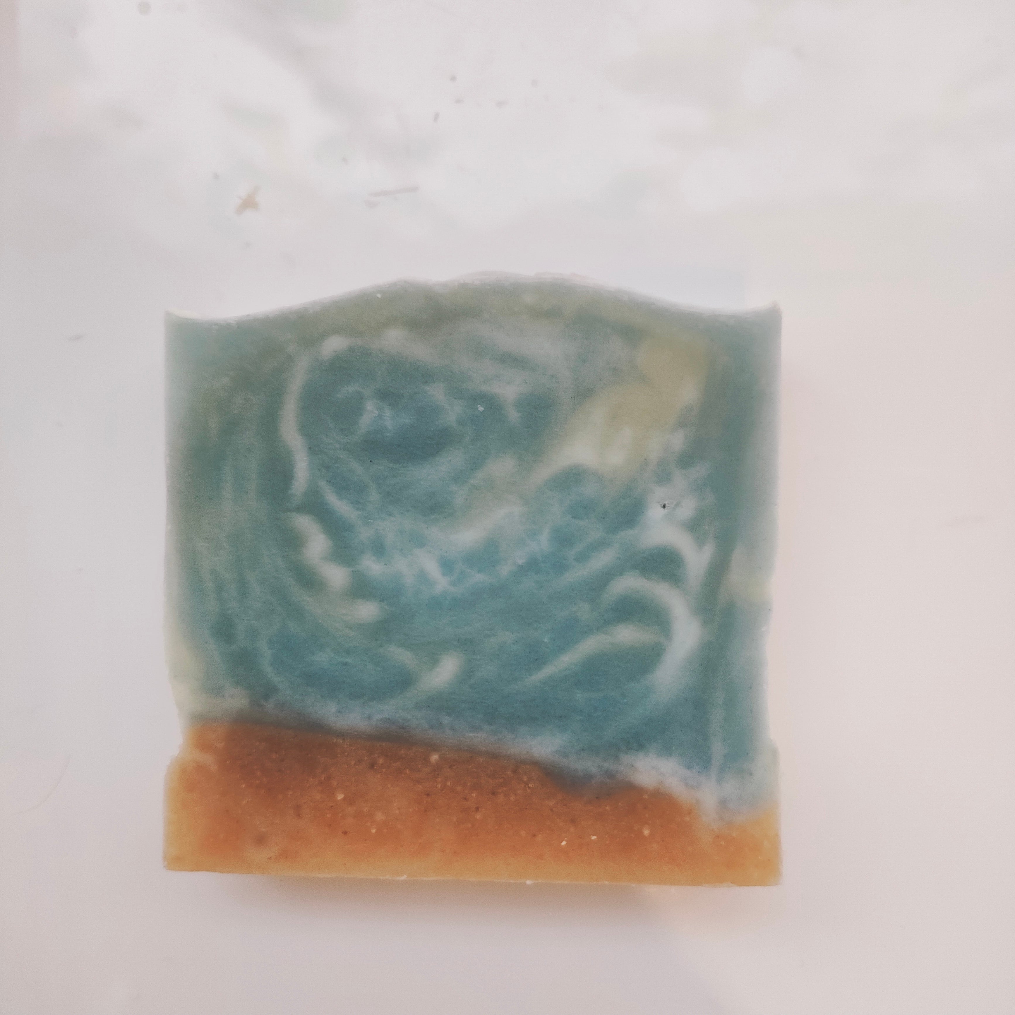 波をイメージしたブルーと白のマーブル模様の下に砂のような茶色の入った石鹸です。